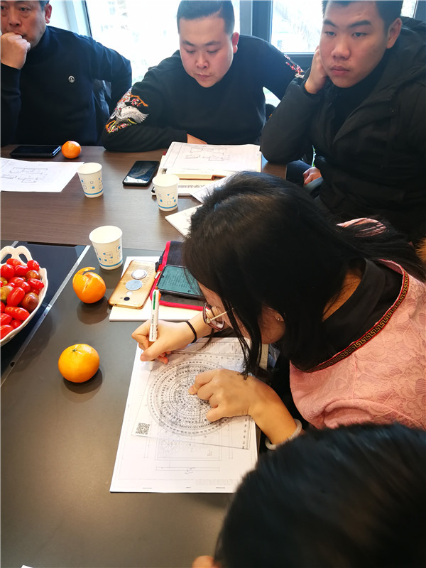 本次活动分为理论回顾和现场实践两部分。理论回顾环节,由王明老师带领大家从风水的起源、发展,到风水在现实生活中的应用逐步进行了回顾。应用八宅风水、金锁玉关风水知识针对将要实践的户型图进行讲解,教大家如何定向、如何使用立极尺以及通过屋宅主人的出生年,确定主人命卦,在遵循东四命住东四宅,西四命住西四宅的原则再结合四吉方、四凶方来布局。王明老讲解言简意赅、幽默风趣,让老学员温故知新的同时又让新参加的设计师也能充分理解风水各项知识含义及在现实设计中应用,现场的研讨氛围十分活跃。